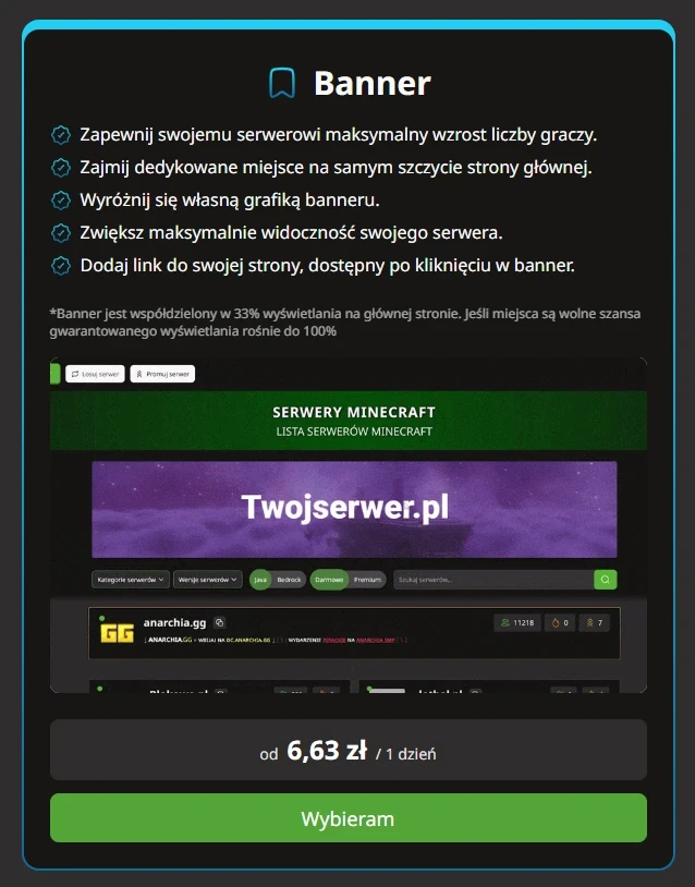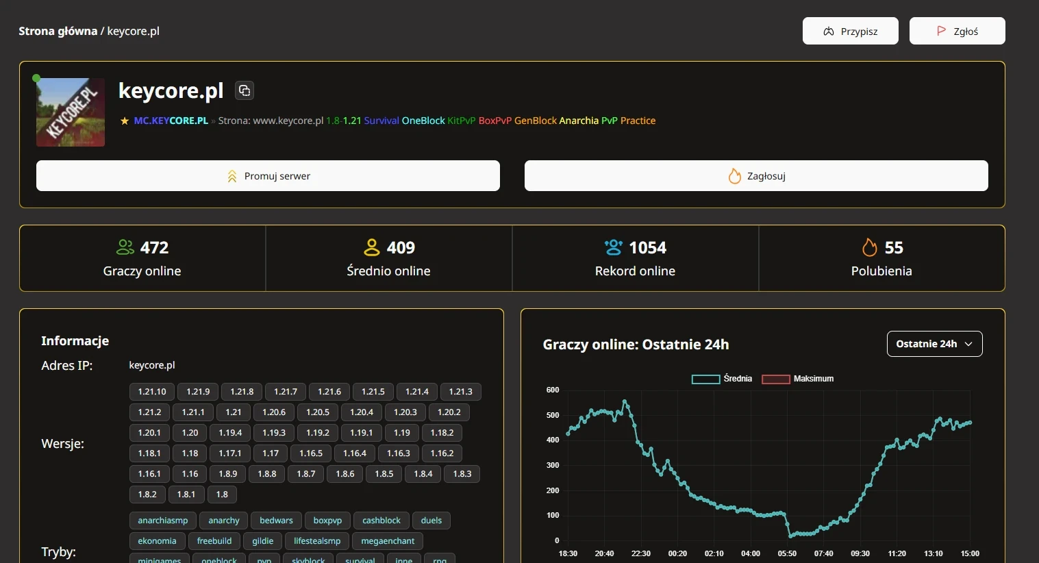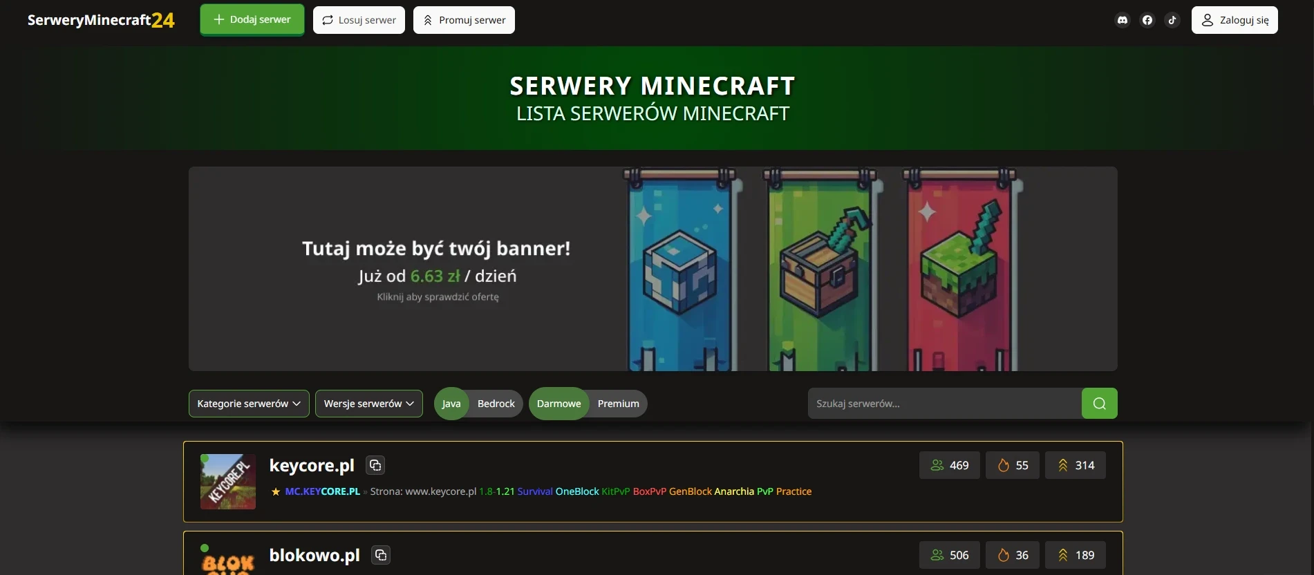SerweryMinecraft24.pl to najnowsza baza polskich serwerów Minecraft, gdzie szybko znajdziesz serwery dopasowane do swoich preferencji. Intuicyjna wyszukiwarka i czytelne kategorie ułatwiają odkrywanie nowych światów i społeczności.